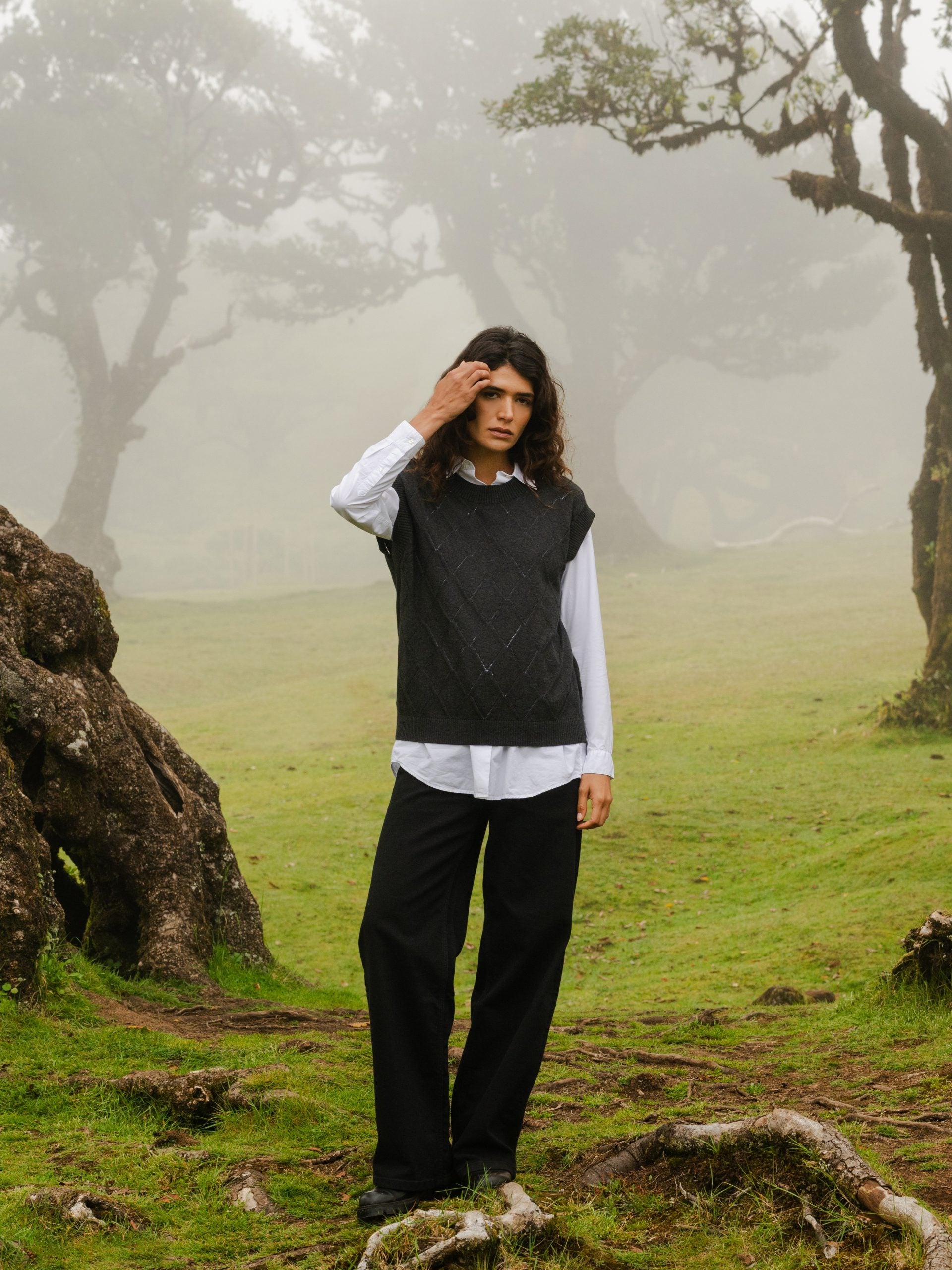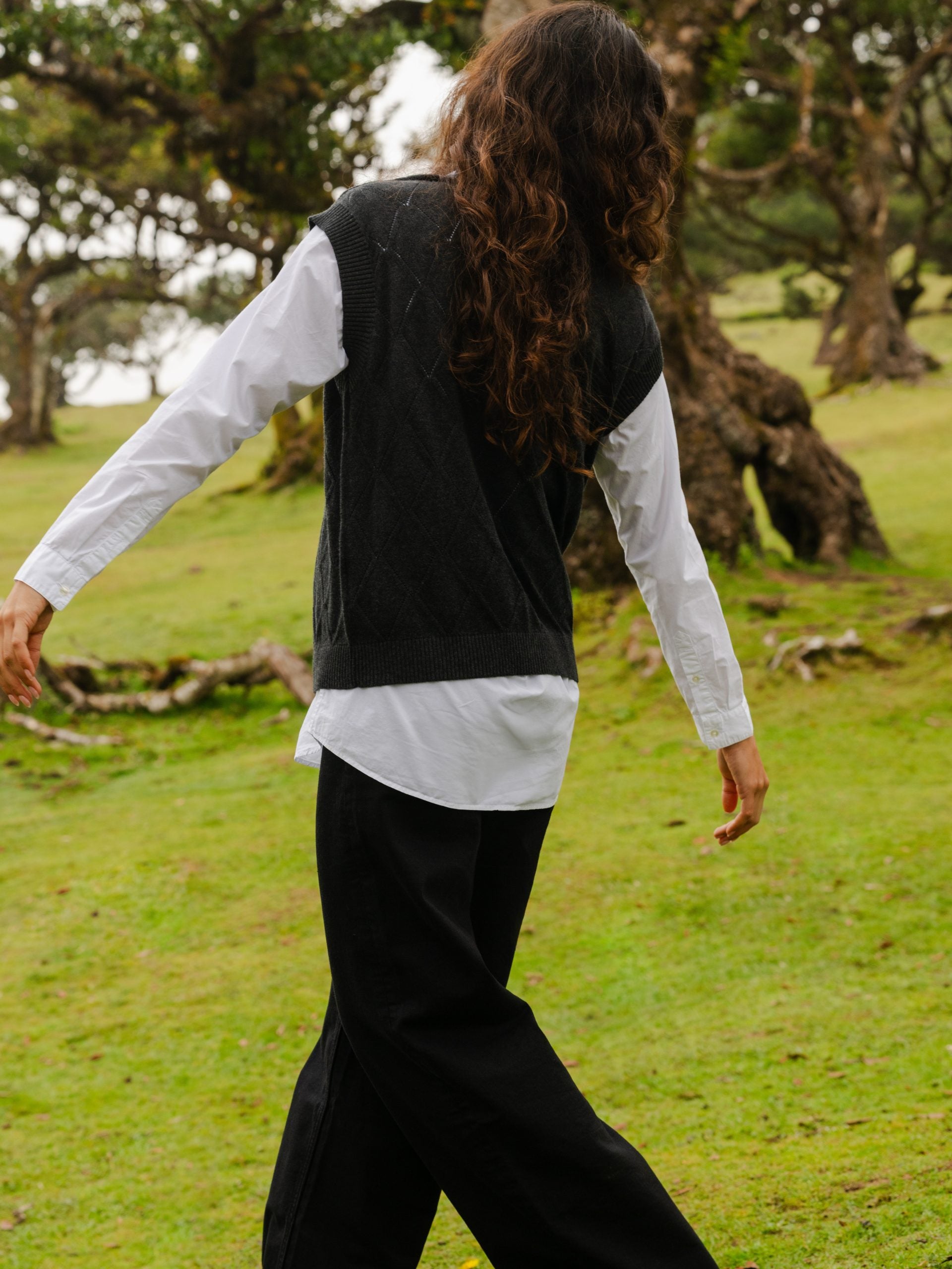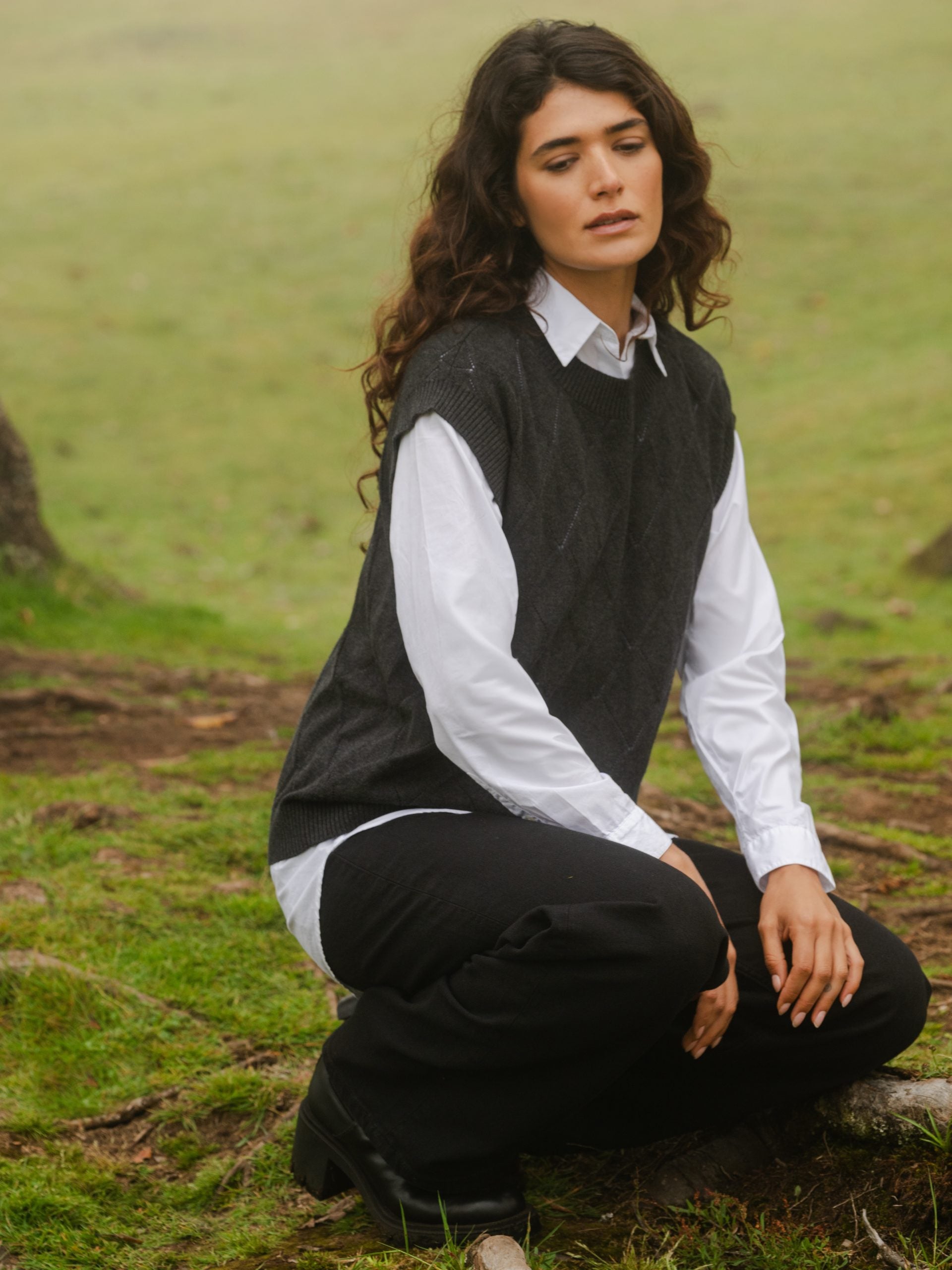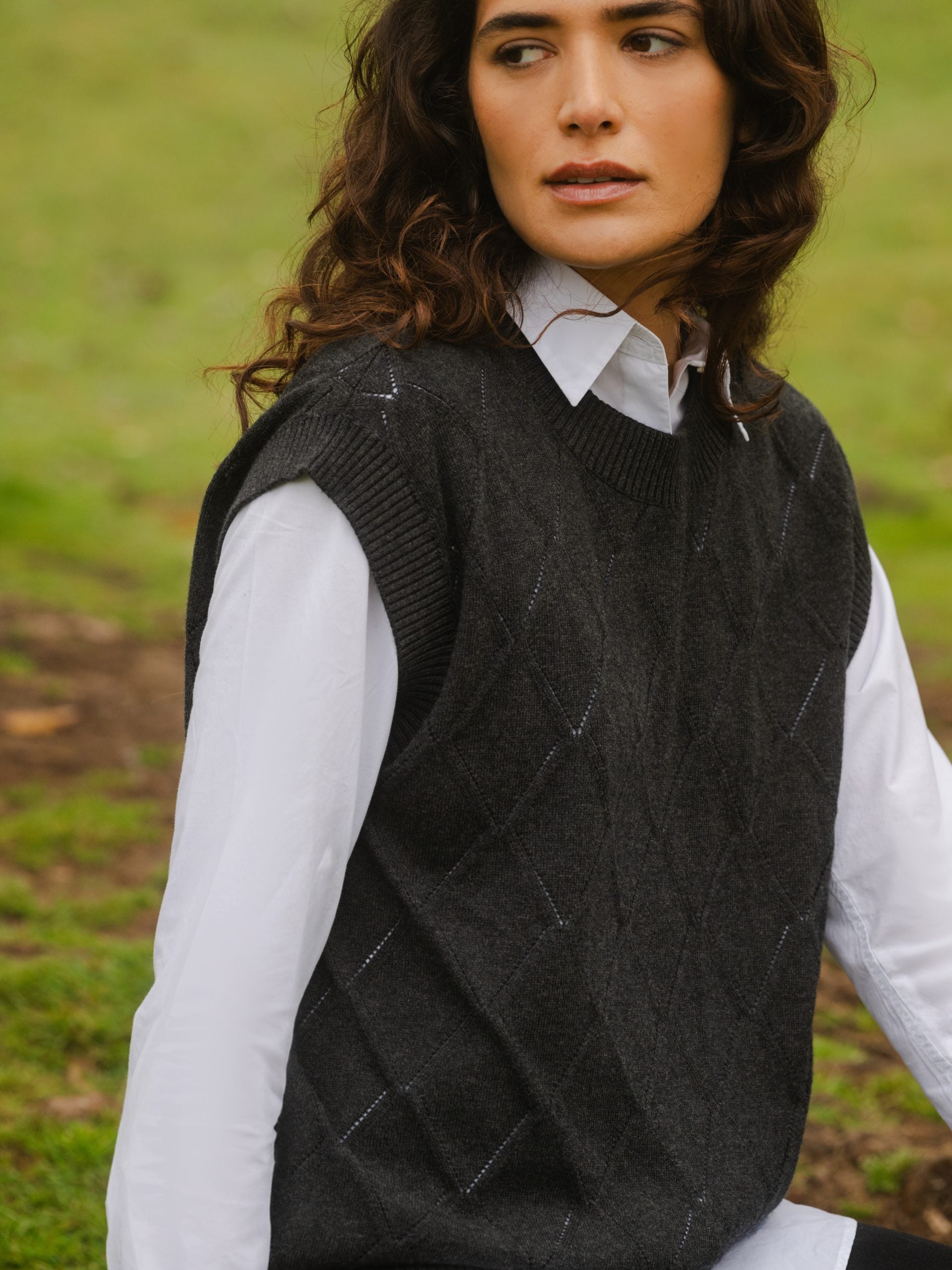 Knitted in a luxurious blend of organic cotton and cashmere, this Eyelet Diamond tank top offers a soft, breathable layer with timeless charm. The intricate pattern adds subtle texture, making it a standout piece whether worn solo on warmer days or layered under a jacket.