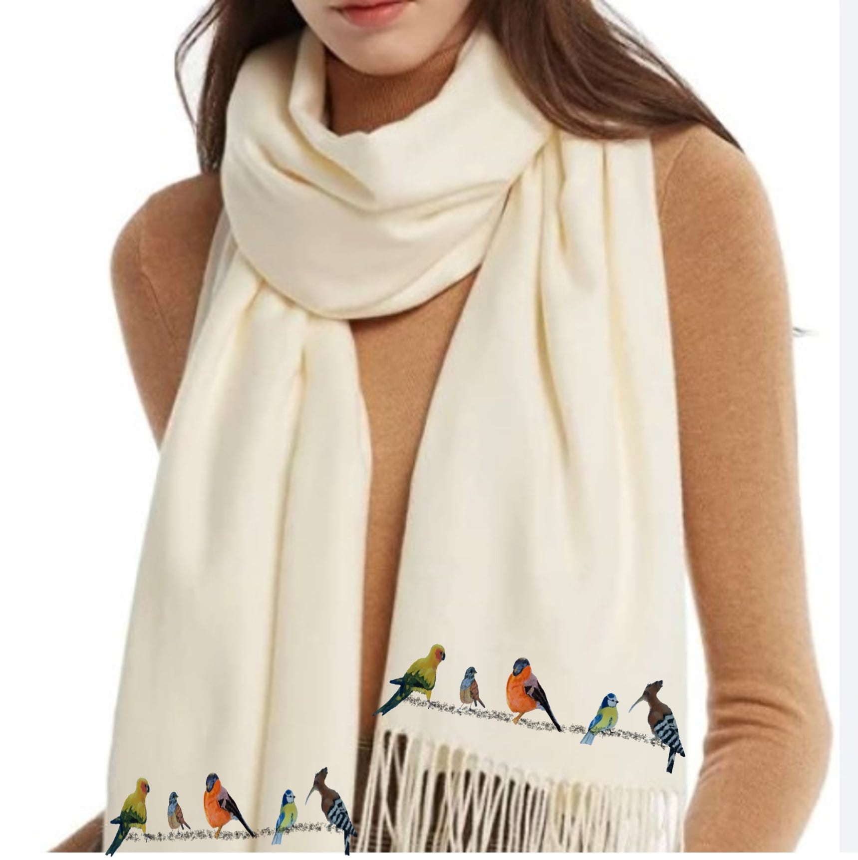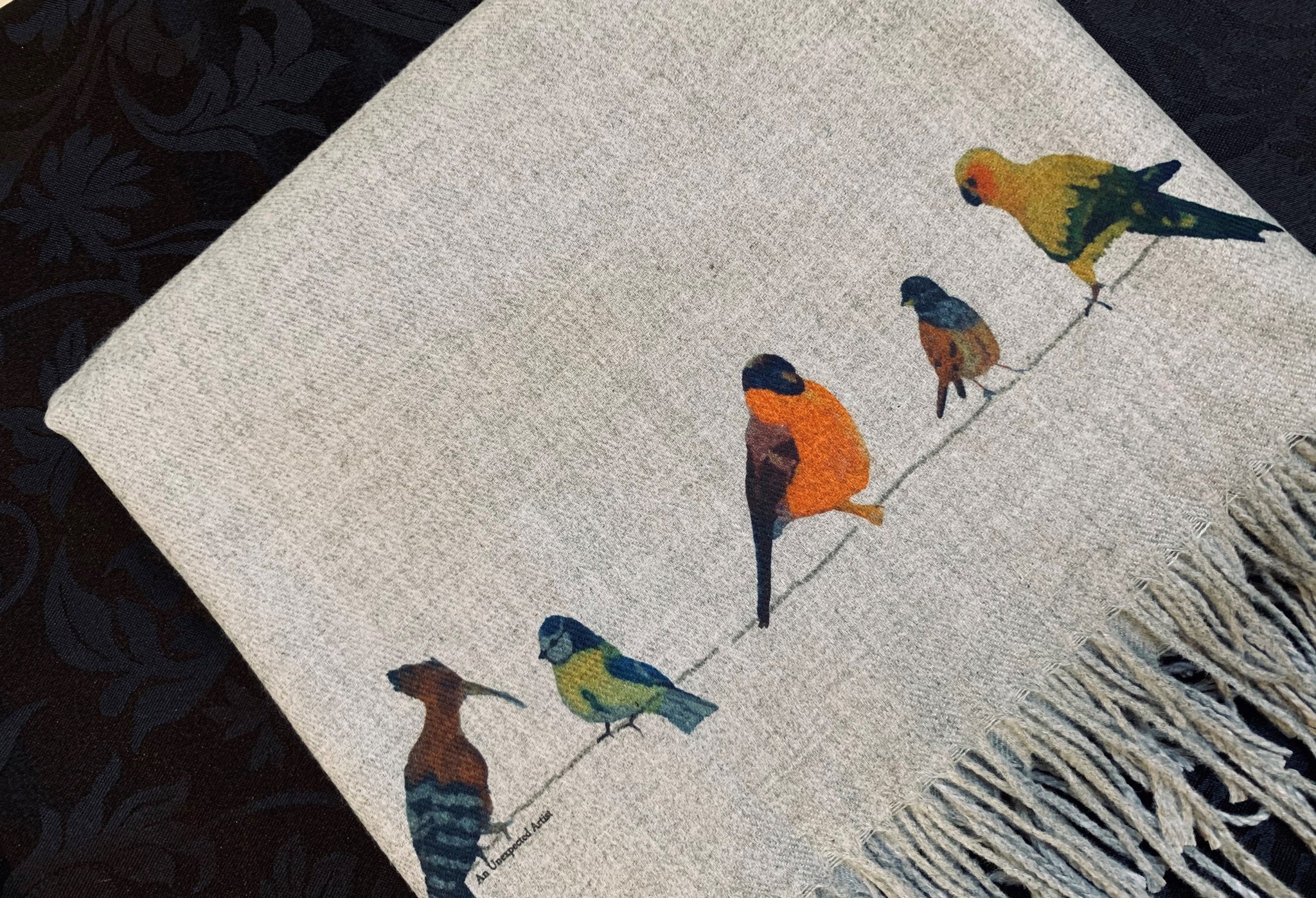 Cashmere Feel Luxury Scarf Handprinted With Birds on a Wire