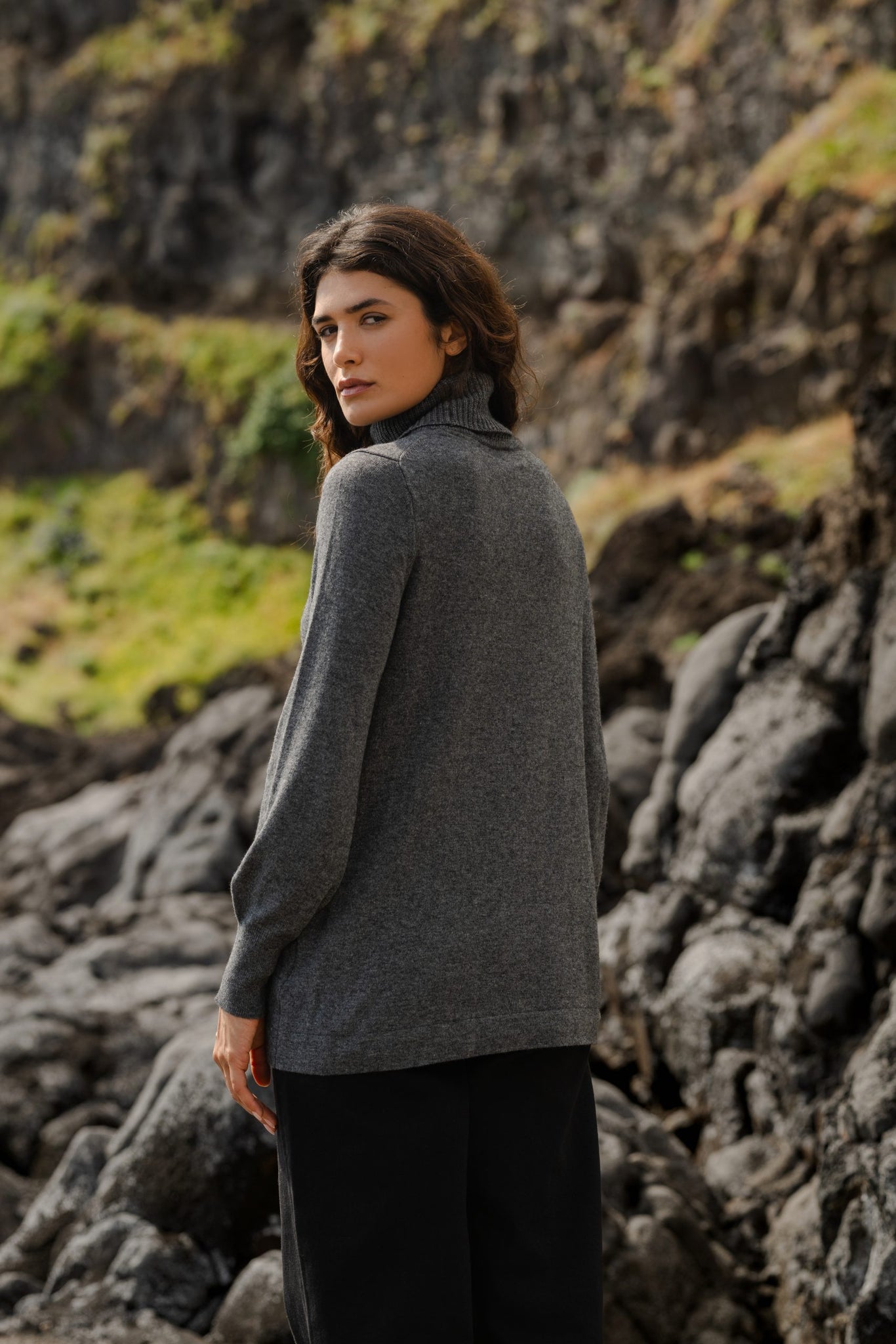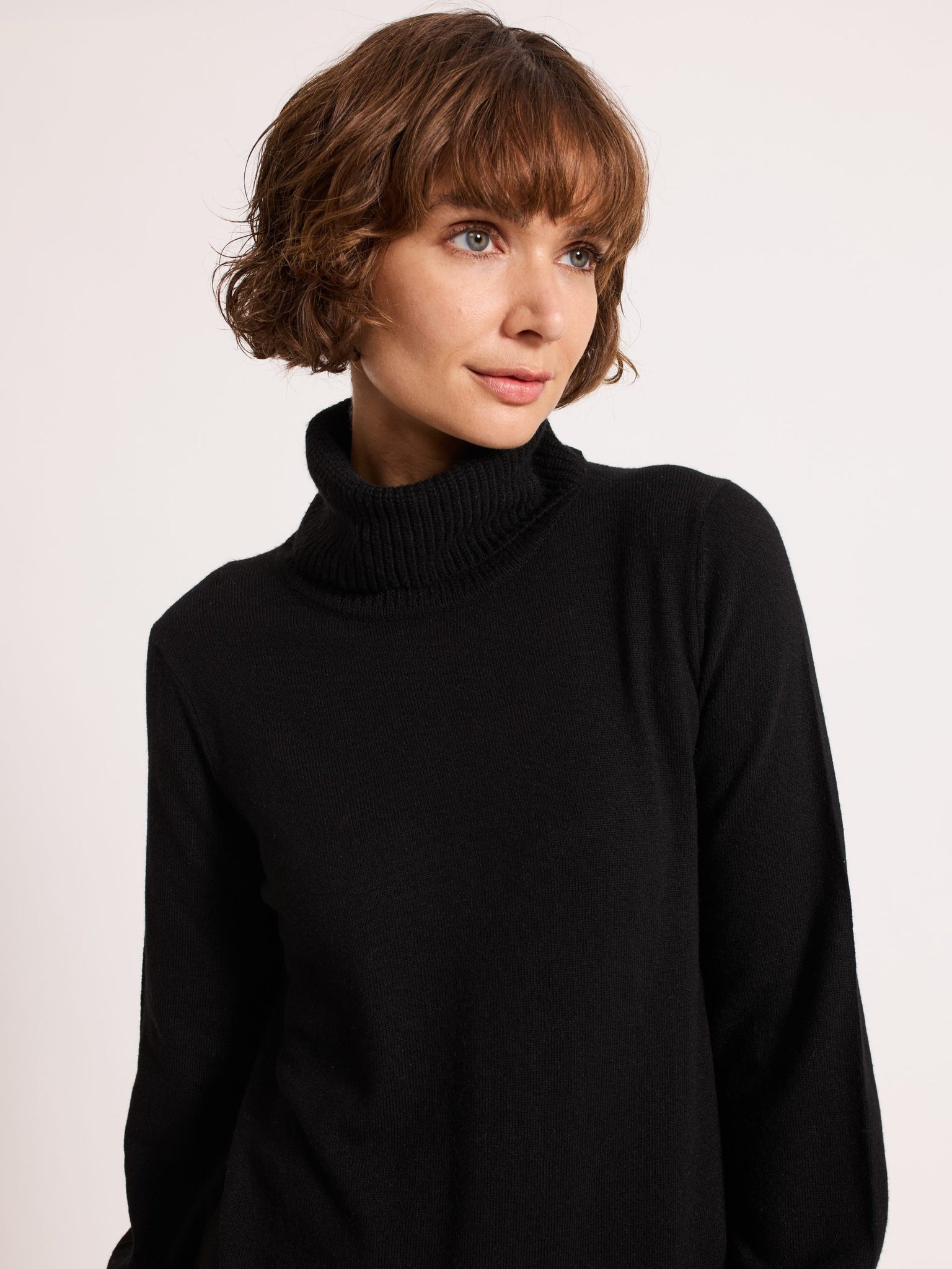 This lightweight longline rollneck jumper is a year-round essential, offering understated elegance with every wear. Its subtle A-line silhouette flatters the figure, while the soft roll neck and gently flared bell sleeves tapering into narrow cuffs add a feminine touch.
