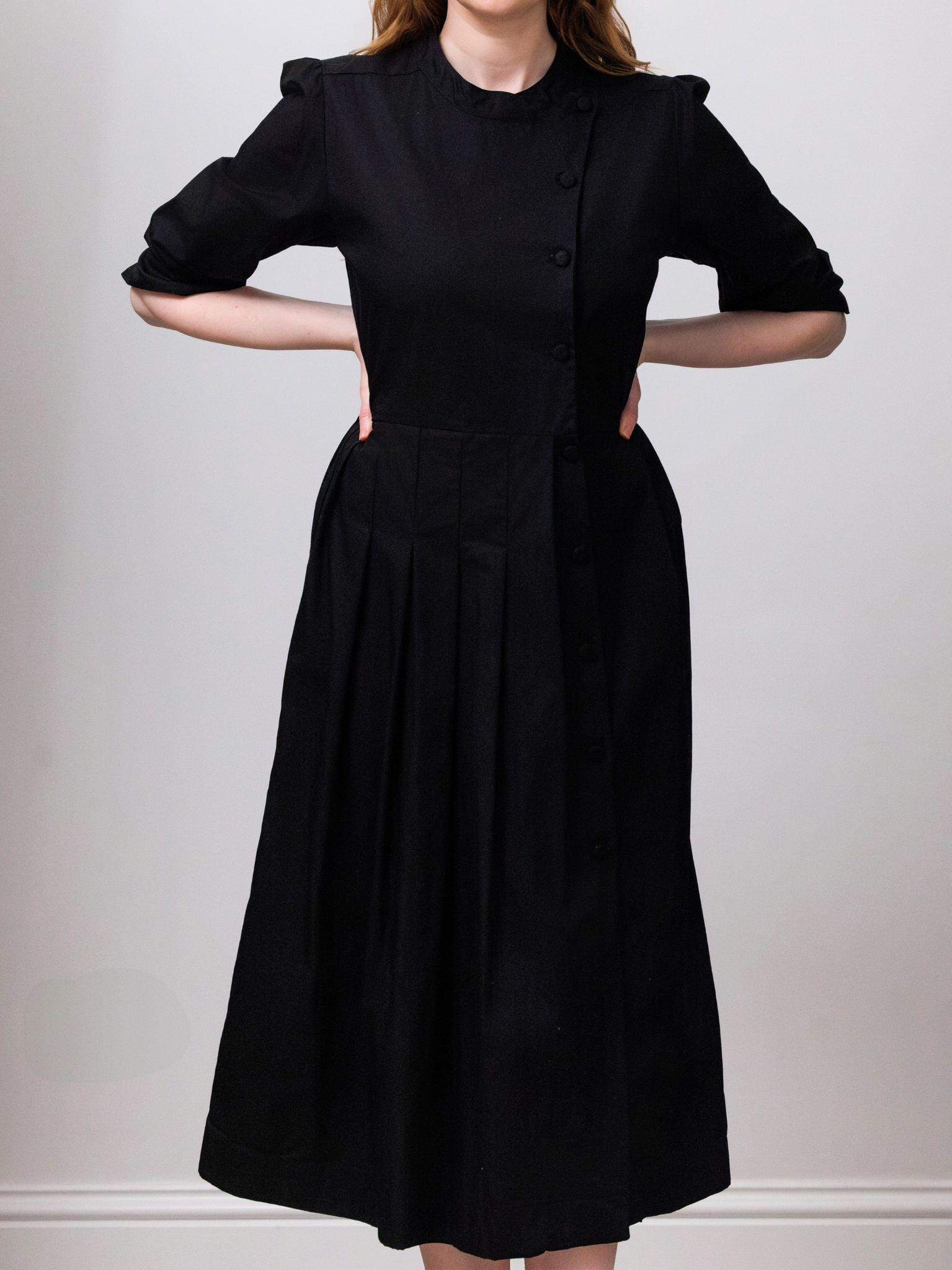 Meet the Talitha Side Button-Down Dress: where circular fashion takes centre stage, and ordinary is left in the dust. Handmade in Brixton from dead-stock black organic cotton. We find the fabrics the fashion world forgot and turn them into something unforgettable.
