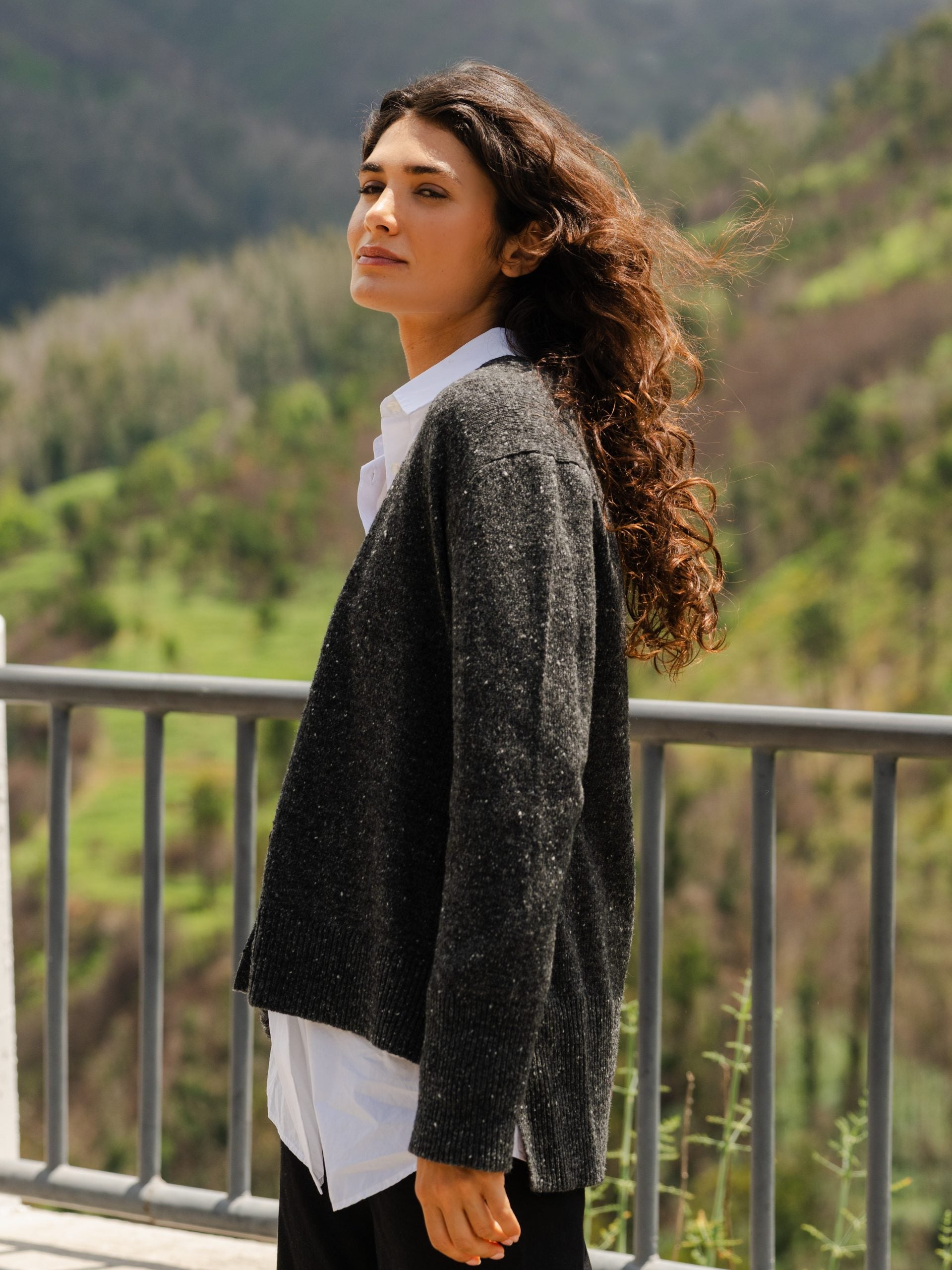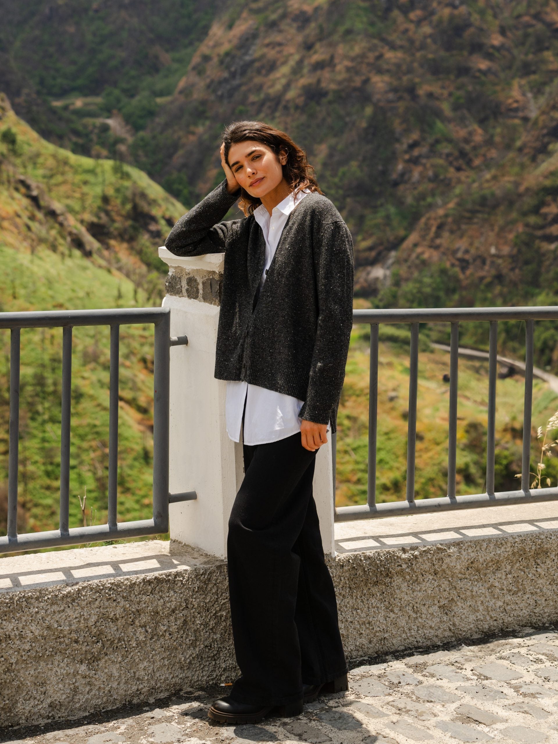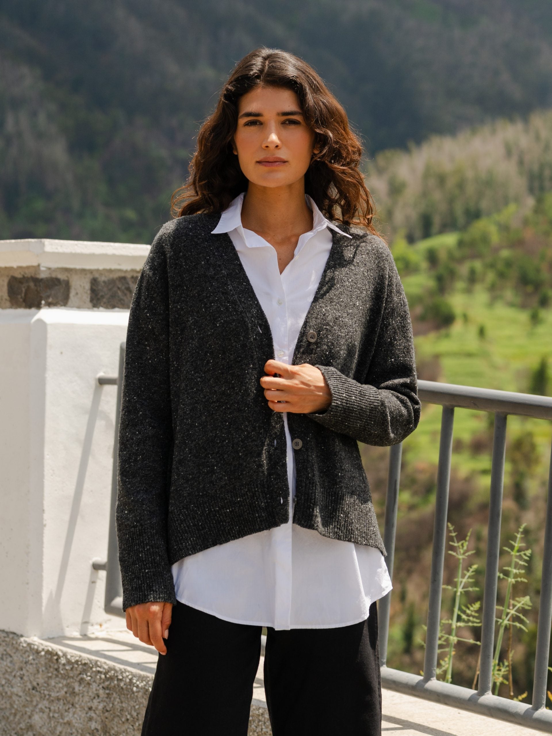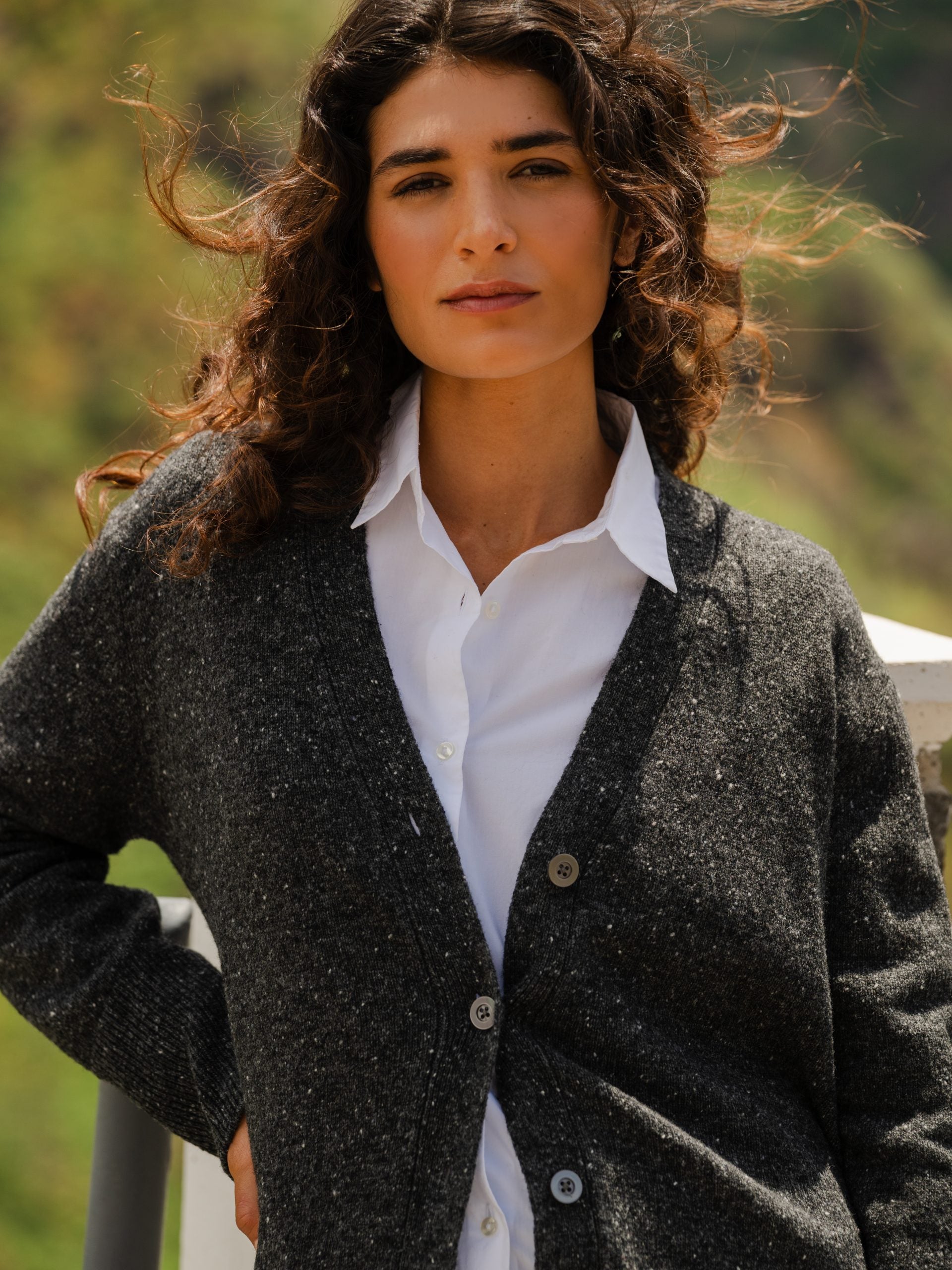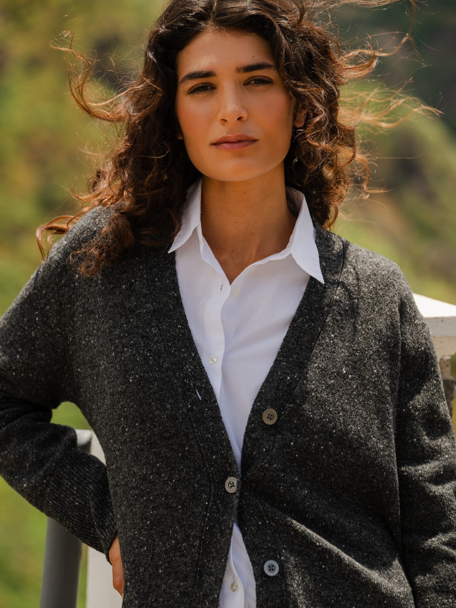 Our boxy, relaxed wool fleck cardigan is the ultimate layering piece for Autumn and Winter. Designed with a shortened button-through front, it lets longer shirt hems peek through for a polished smart-casual look. The elongated ribbed back adds structure and sophistication, balancing comfort with style.