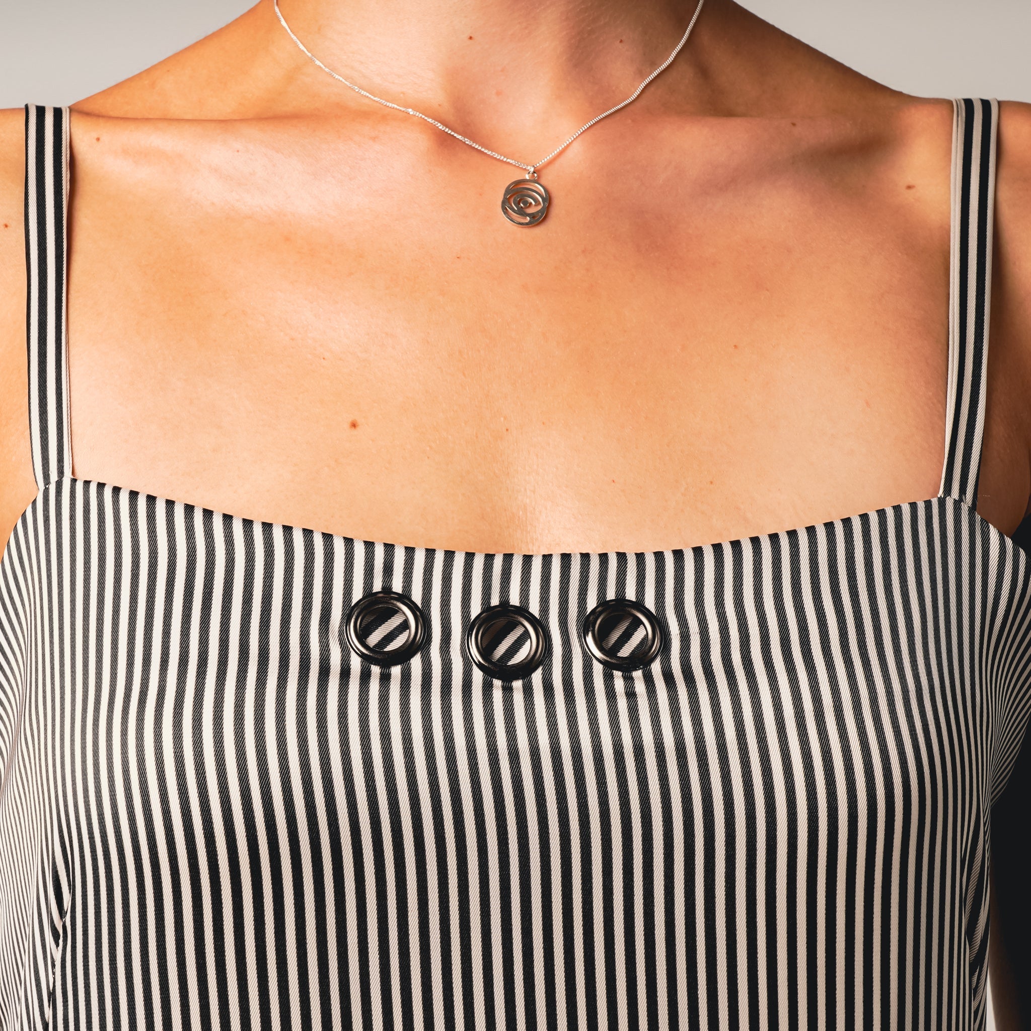 Turn heads with this show-stopping silhouette. Crafted in our signature silky striped fabric, this full-length evening dress features a flattering fitted bodice and flowing flared skirt designed to move beautifully with you. The delicate straps and signature eyelet detail add refined edge, while the soft bamboo silk lining ensures comfort all night long. An effortlessly elegant piece for formal events, summer weddings, or evenings out where you want to make an entrance.