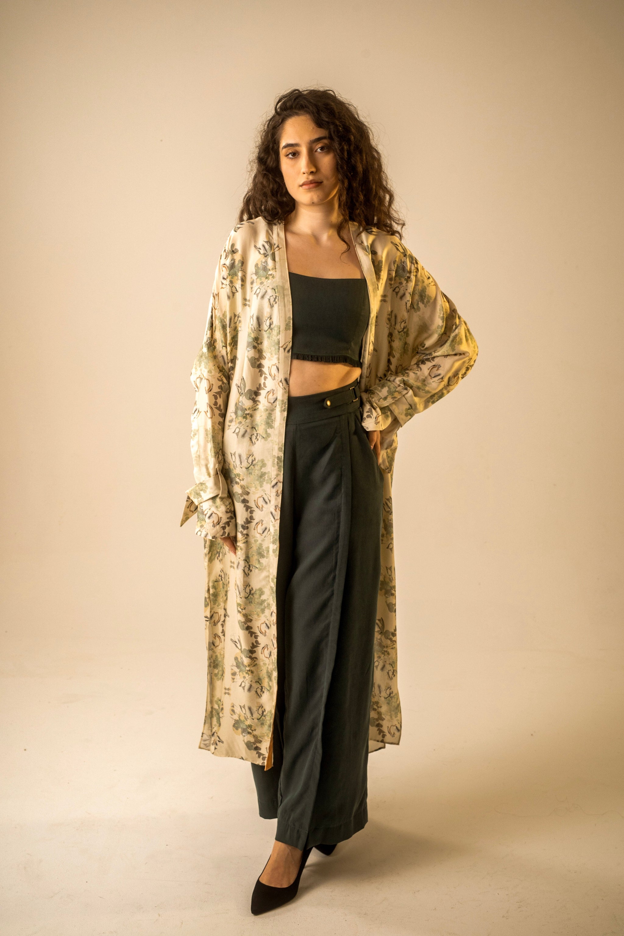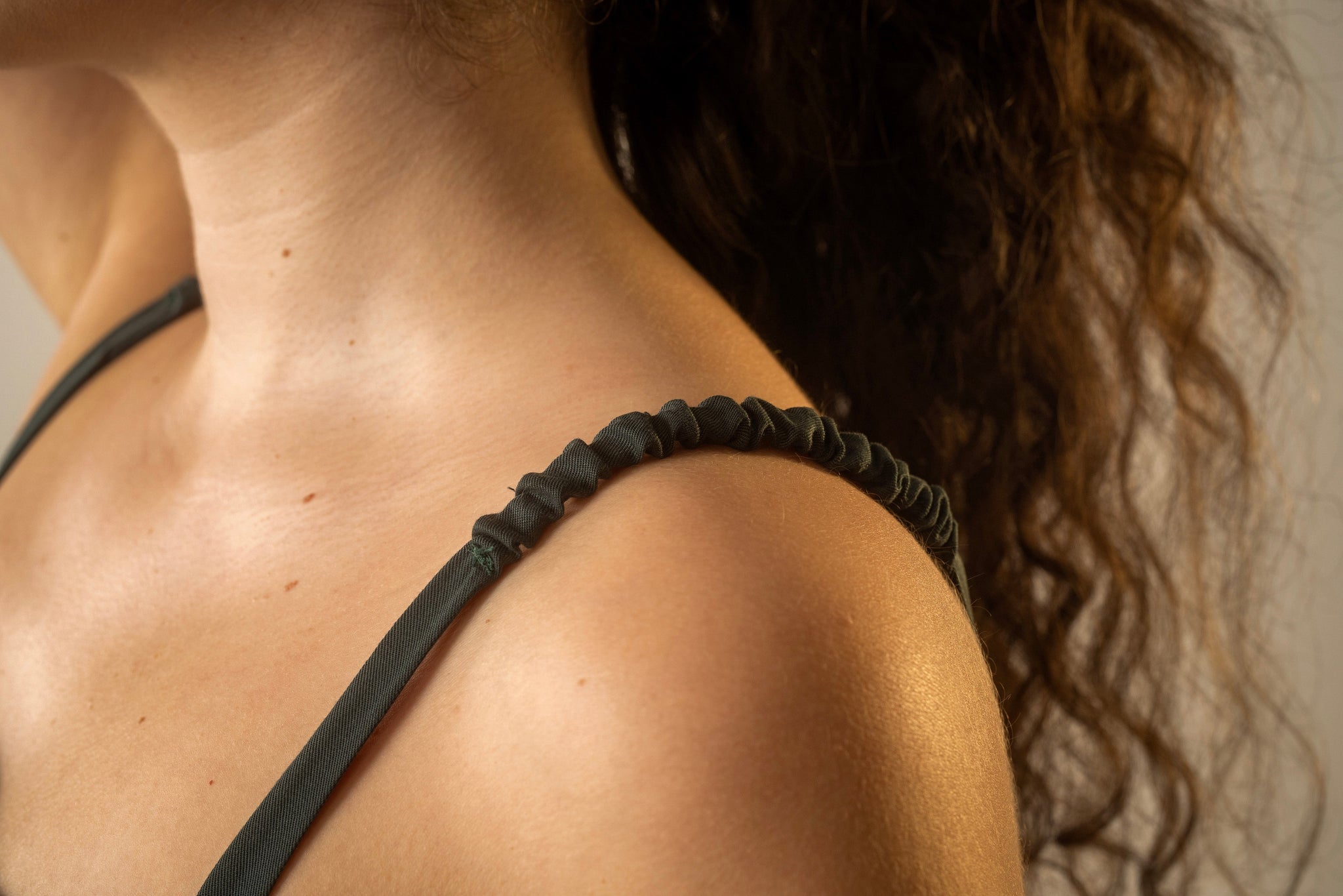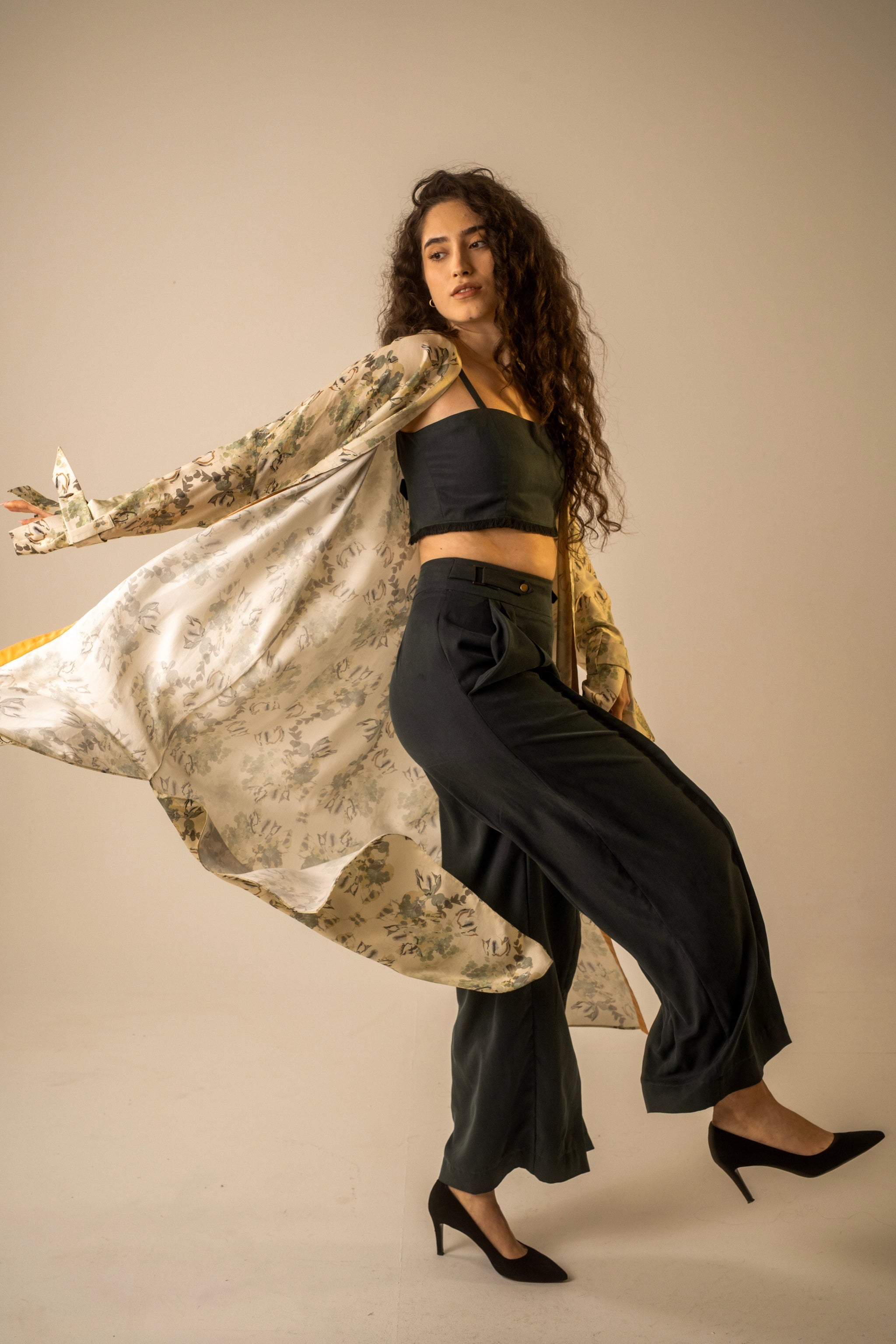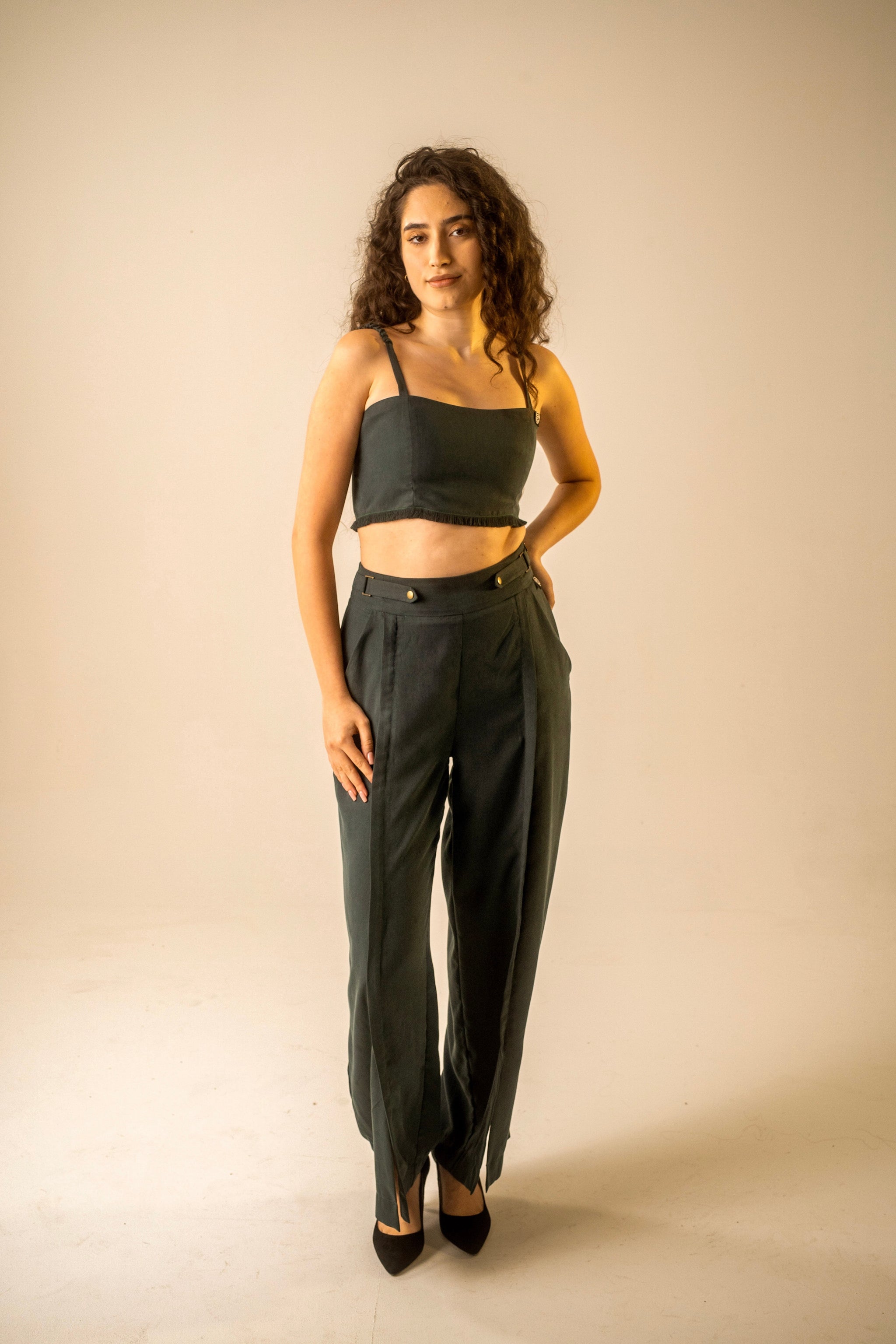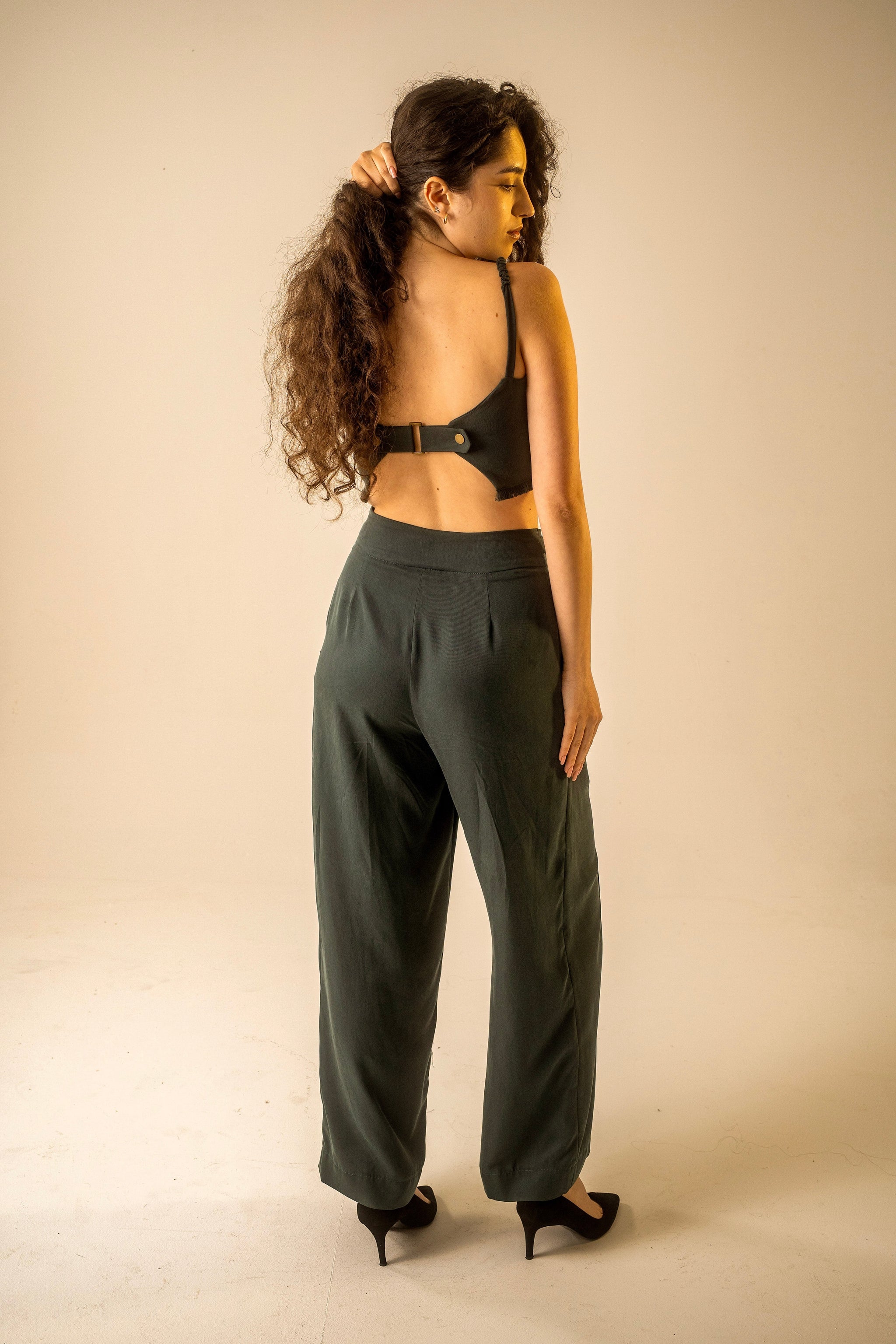 Bold colour meets statement shape. The Teal Bralette is a cropped style finished with a delicate fringe trim and comfortable popper back opening. — It's perfect paired with the matching Pleat Trousers or layered under a jacket.