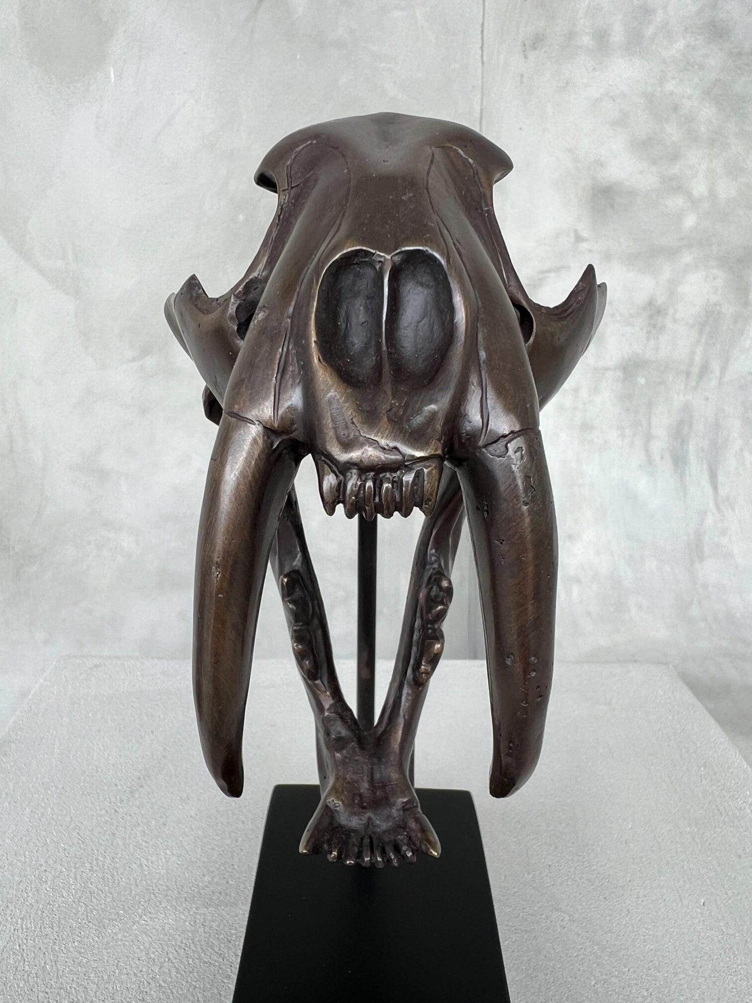 The skull is displayed on a custom-fit black base, made from wood and steel. It can be detached from the base if desired.