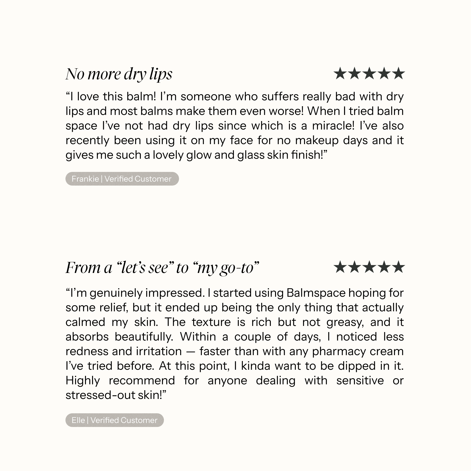 Balm Space was born from a simple belief that self care should feel effortless yet meaningful. After seven years working in the beauty industry, Sammy set out to create products that simplify routines rather than overwhelm them. The brand began with the Universal Balm, a multi-purpose skin essential made in the UK and formulated to nourish, hydrate and elevate everyday moments. Designed for real life, dry lips, dehydrated skin, brows, cuticles, fly-away travel and long days on the go, Balm Space embraces “less but better,” encouraging small rituals that bring calm into busy lives. With a focus on intentional living, sustainable choices and clean, vegan, dermatologically tested formulas, Balm Space exists to empower mindful daily rituals. And as the balm collection grows, the mission stays the same - beautifully simple products that create a little more space in your day.