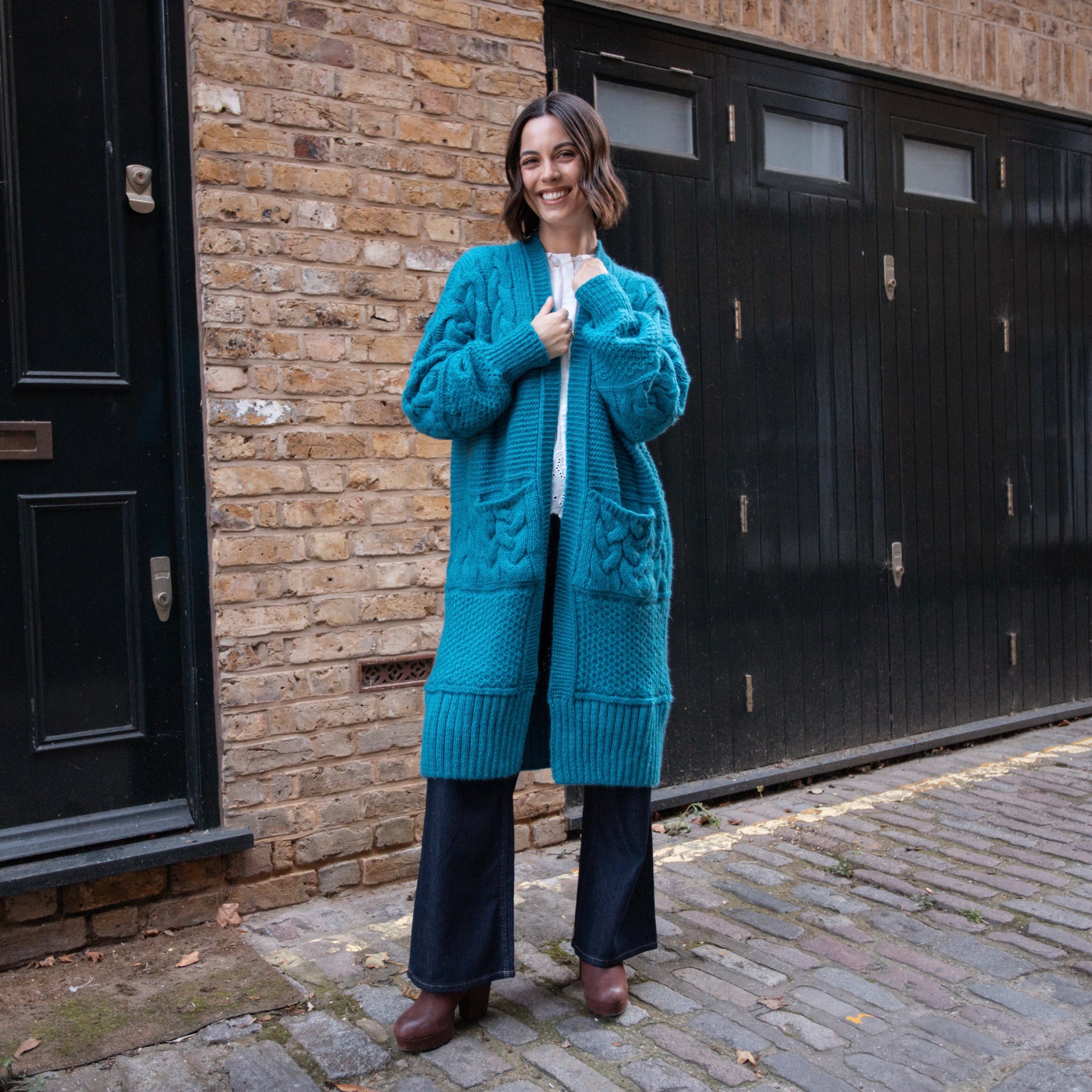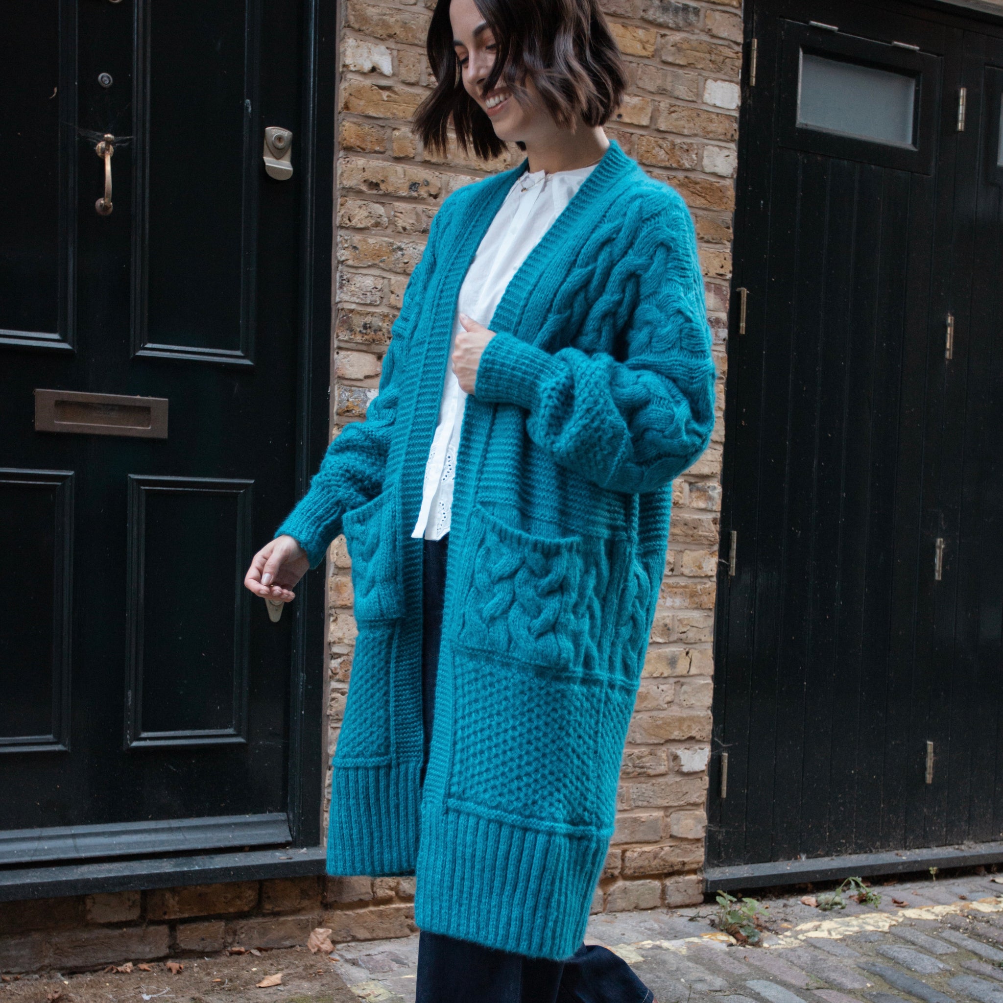 Say hello to Alex – your go-to oversized cardigan with a bold twist. Crafted in a rich teal hue and full of textural detail, Alex features chunky cables, deep patch pockets and an easy open front. The silhouette is very relaxed and slouchy, making it perfect for layering across seasons.