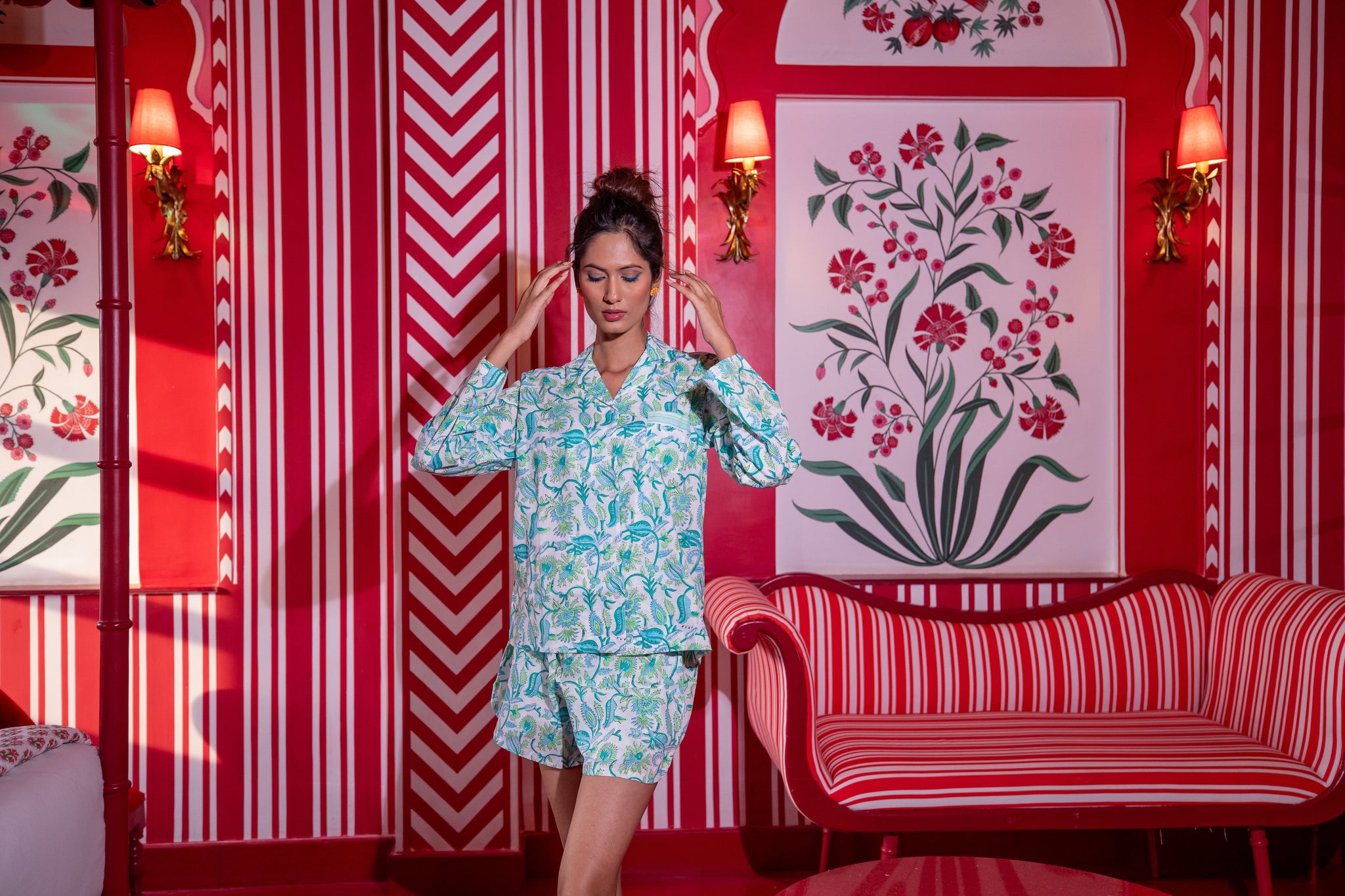 Our bestselling Pyjamas SHORTS-set return in a series of beautiful colours. Hand block printed on the softest pure cotton by small communities of master craftsmen I have worked with for decades.