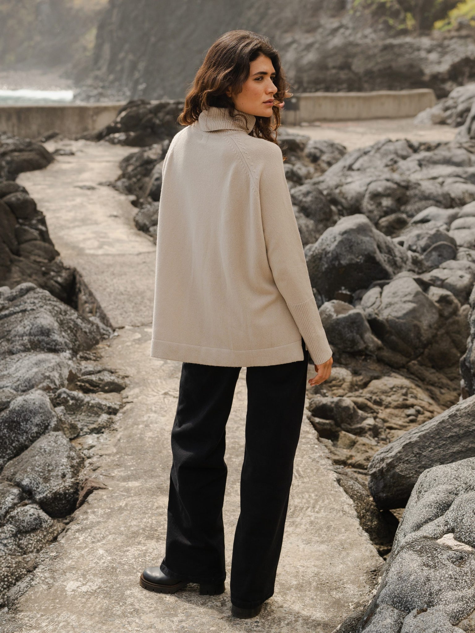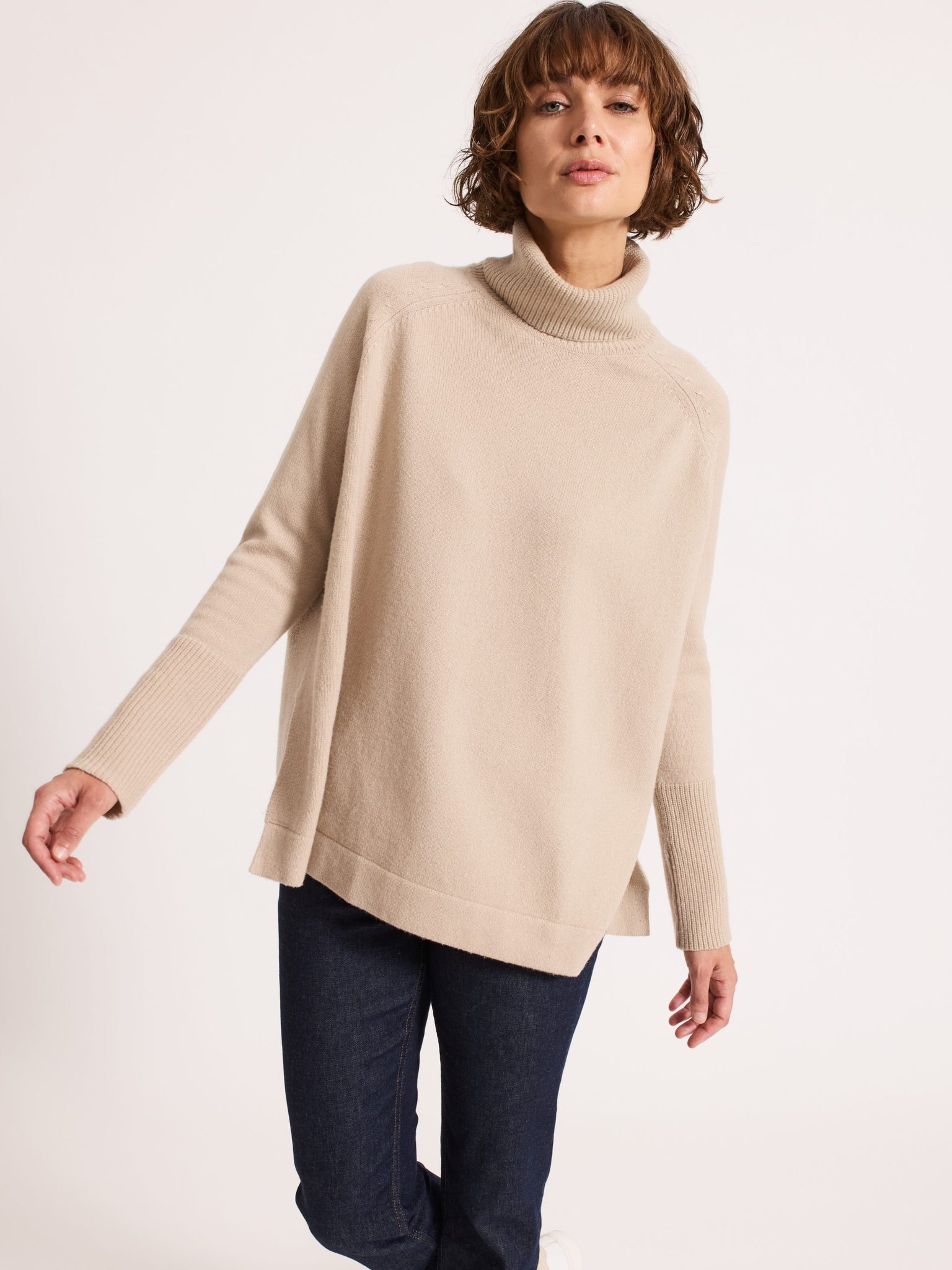 This relaxed oversized jumper is the epitome of winter comfort, crafted from a delicate sustainable yarn that feels indulgently soft against the skin. Its generous boxy shape and lofty silhouette offer a cocooning feel, while the soft roll neck and elongated cuffs on narrow sleeves enhance its cozy appeal.