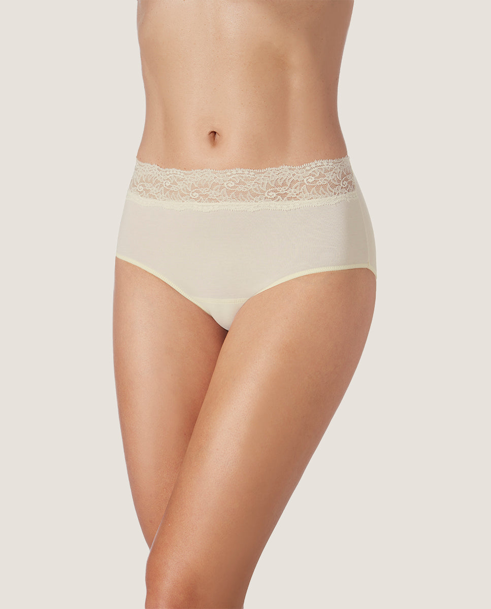The Atenea Lace Maxi Brief combines elegance and comfort. Made from soy fiber, it features delicate lace accents for a refined touch. Soft, breathable, antibacterial and hydrating by nature, it offers all-day comfort and subtle sophistication. Crafted in Spain by ZD Zero Defects.