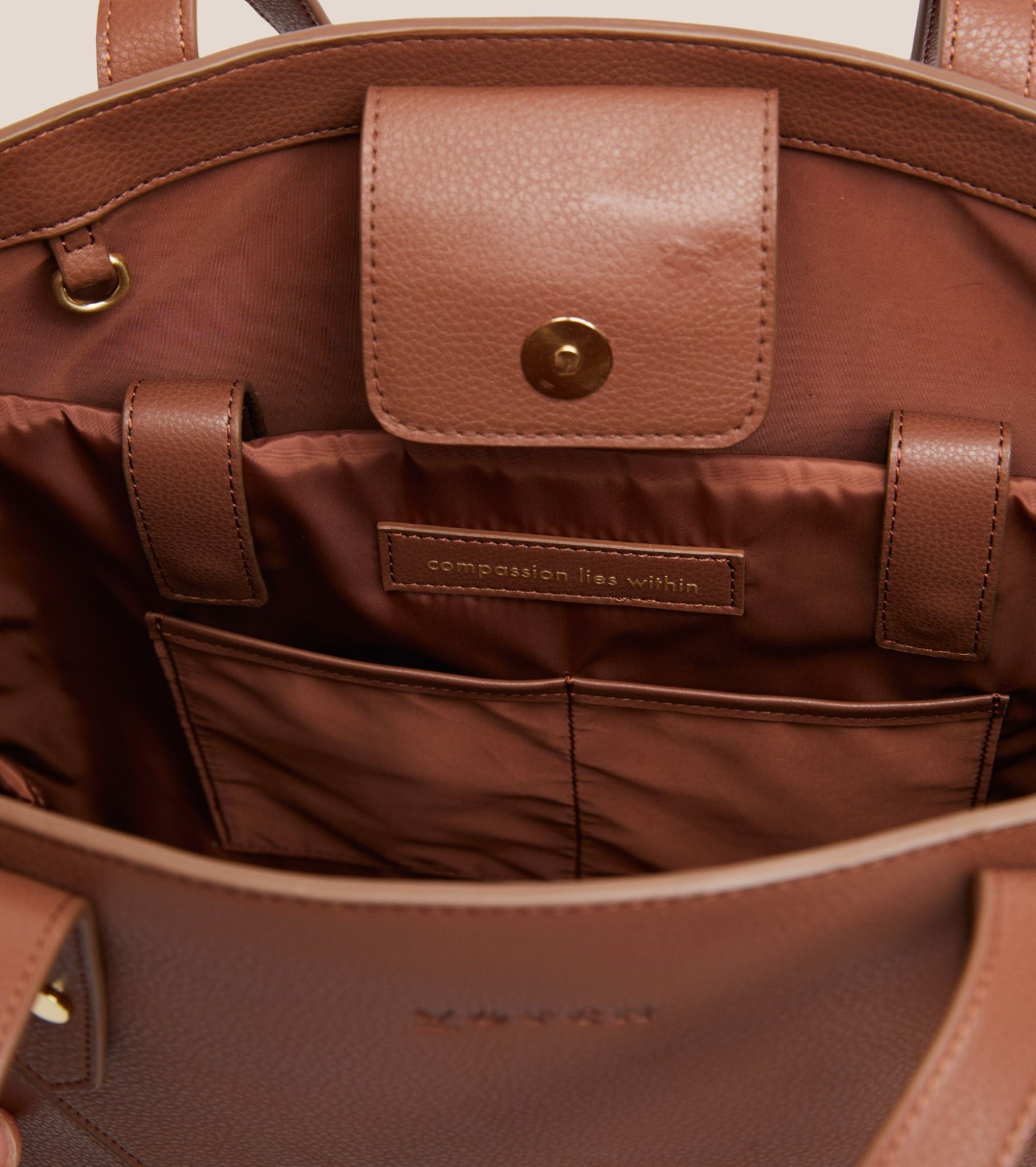 Thoughtfully designed, it features a padded laptop section that comfortably fits a 13-inch laptop, along with two slip pockets, an internal zip compartment, and a bottle holder to keep you organised throughout the day. Subtle "compassion lies within" detailing reflects our commitment to cruelty-free craftsmanship.