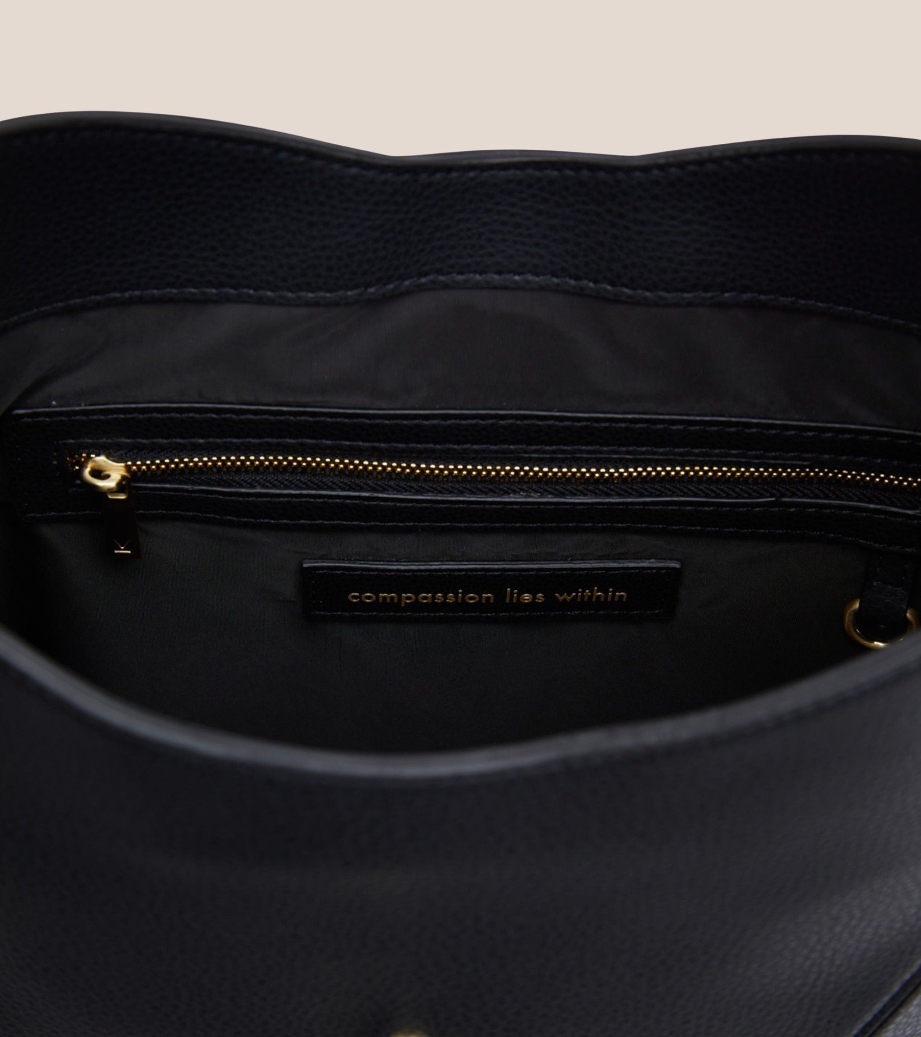 The Nancy features a brushed gold V magnetic flap to secure the bag, paired with a discreet external zip compartment for quick access. Inside, thoughtful organisation takes centre stage with a zip compartment, two slip pockets, a key ring loop, and a meaningful "compassion lies within" detail that reflects the values behind its design.