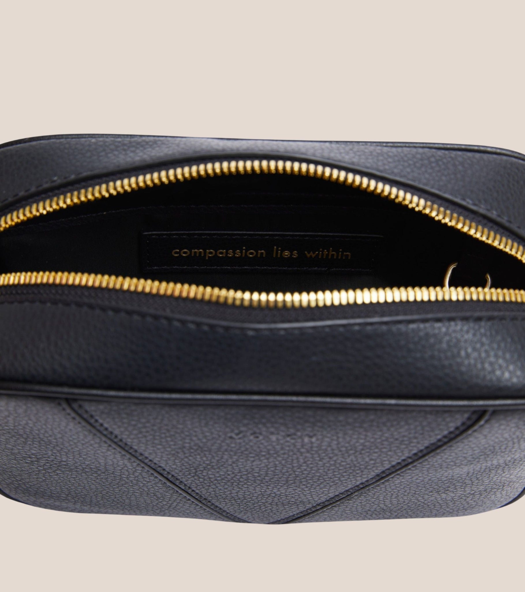 Inside, the bag is lined with RPET fabric, offering thoughtful details such as an internal key loop, a dedicated mobile phone compartment, and a discreet exterior zipper pocket. A hidden message, "compassion lies within," reflects the values behind the design, making this bag as meaningful as it is functional.