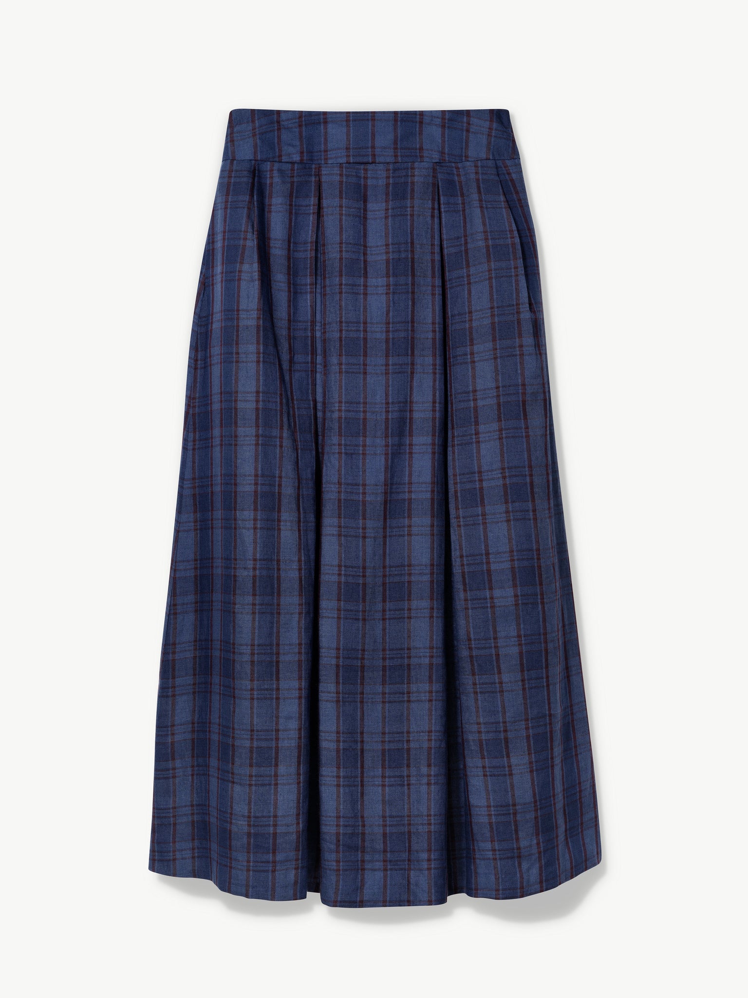 Max out your style game with the Valery Maxi Skirt. A masterpiece of circular fashion and organic clothing that screams individuality. Handmade in Brixton from deadstock fabric the world forgot, this skirt is our triumph as sustainable fashion designer who know how to blend style with principles. The organic linen in a moody blue check with burgundy stripes is a nod to timeless rebellion.